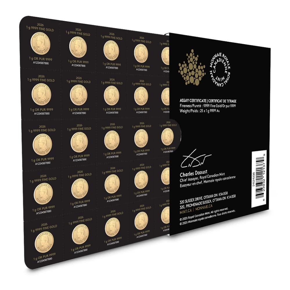 Each 2026 25 Gram Canadian Gold MapleGram includes a large blistercard that securely houses 25 individual 1 Gram Gold Maple Leaf Coins. The blistercard is packaged within an outer protective sleeve and comes with an assay card from the Royal Canadian Mint to confirm authenticity. The sealed packaging also includes identifying hallmarks for each individual coin.