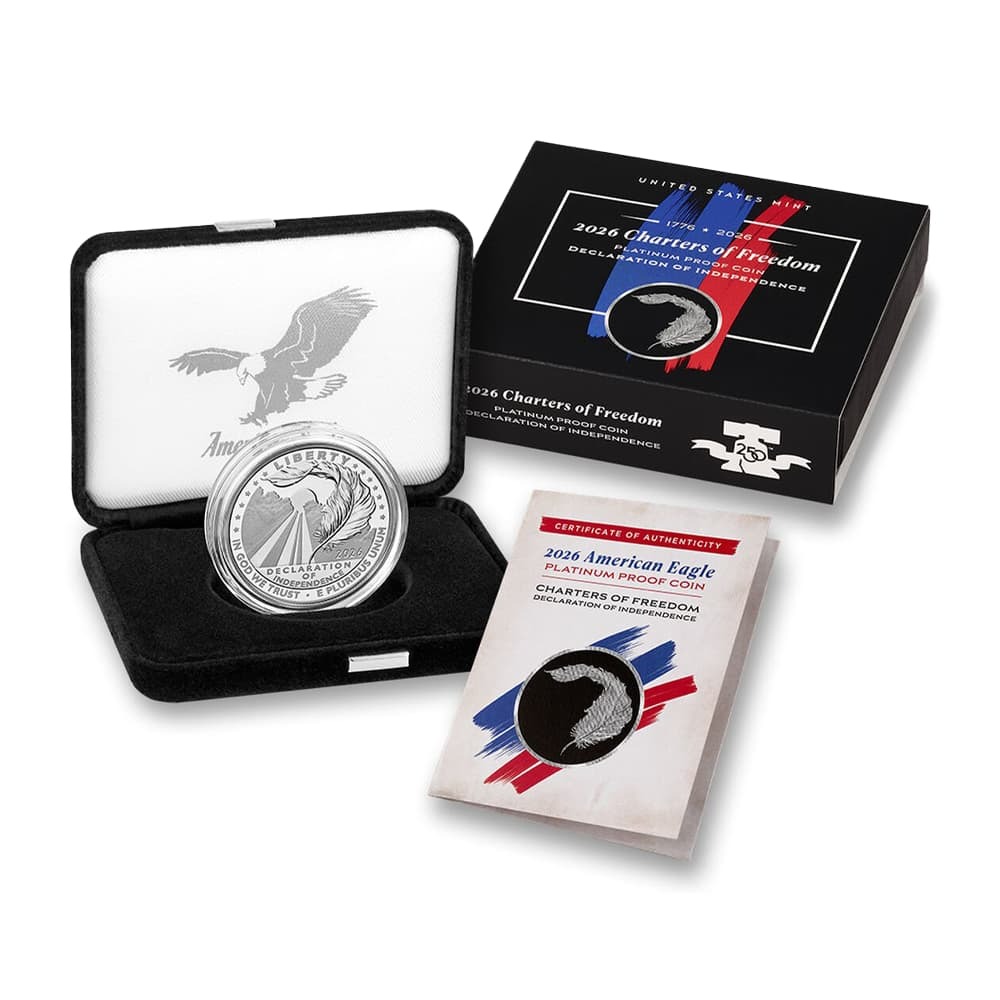 As the United States marks its 250th anniversary in 2026, the United States Mint introduces its next design mini-series for the Proof American Platinum Eagle. The first design in this new series, known as the Charters of Freedom, fittingly pays tribute to America’s Declaration of Independence, signed 250 years ago in 1776. Right now, 2026-W 1 oz Proof American Platinum Eagle Coins are available.