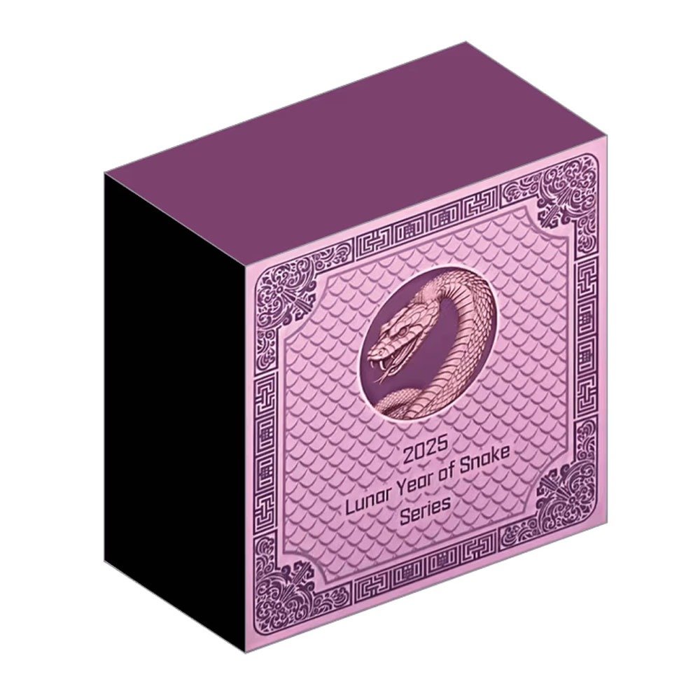 These 2025 5 oz Fiji Silver Snake Rectangular Coins are available with individual presentation packaging. The coins are housed within display boxes that include a Certificate of Authenticity. Each coin boasts a thin layer of 24-karat gold throughout for enhanced visual appeal.