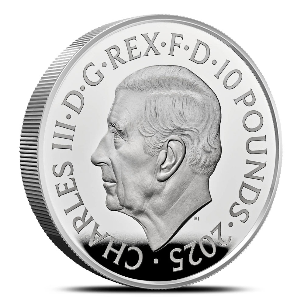 In the obverse design of the 2025 5 oz Proof Silver Tudor Beasts The Greyhound of Richmond Coin features a left-profile portrait of King Charles III. Designed by Martin Jennings in 2022, the image presents the monarch without a crown.