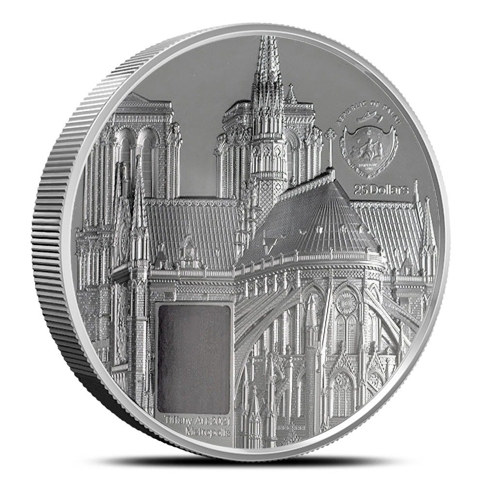 The exterior of the Notre Dame cathedral can be found on the obverse of 2021 5 oz Proof Palau Tiffany Art Metropolis Notre-Dame de Paris Silver Coins. While we don’t get a full view of the cathedral, this beautiful rendering gives us a great sense of the Gothic stylings of the architecture. You will also find the official Palau coat of arms on the obverse design.
