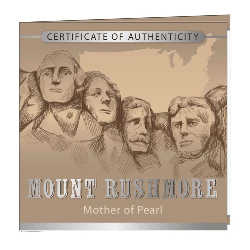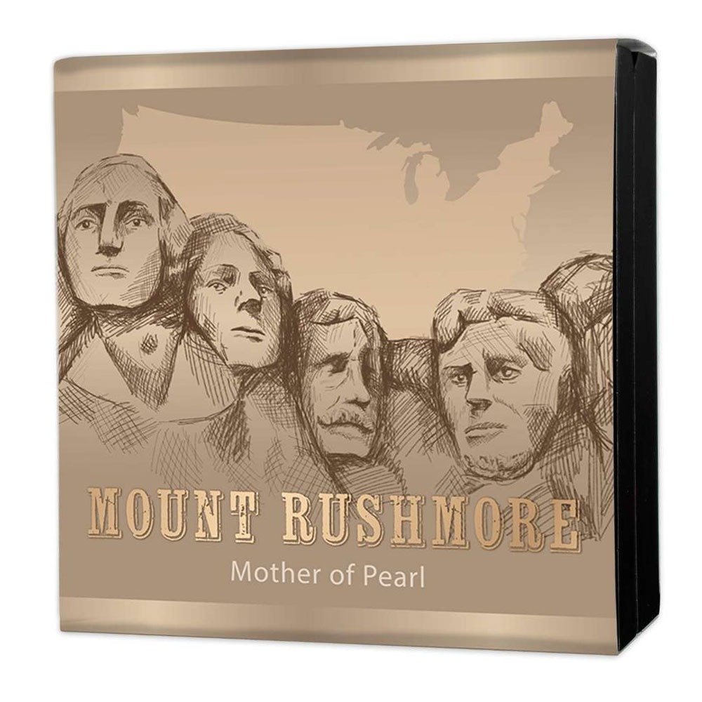 All 2025 5 oz Proof Solomon Islands 100th Anniversary of Mt. Rushmore Silver Coins are individually packaged in presentation boxes. The coin and presentation box arrive with a Mt. Rushmore-themed shipper and a Certificate of Authenticity. These proof coins have frosted designs and mirrored fields, as well as a salmon-red Mother of Pearl inlay on the Mount Rushmore imagery on the reverse.