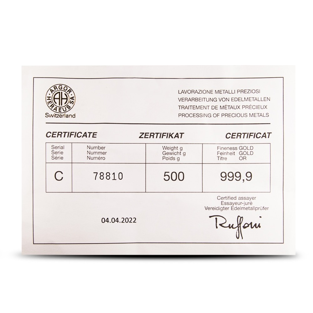 - Contains 500 Grams (16.075 Troy oz) of .9999 pure gold content.