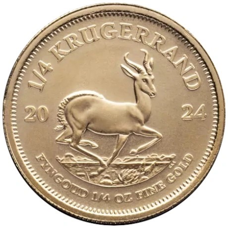 The 2024 1/4oz Krugerrand is a South African gold coin, minted by the Rand Refinery. The weight of the coin is 8.48 grams with a fineness of 916.7 (22 carat gold), this means it contains 7.77 grams of pure gold. The diameter of the coin is 22.06 mm. The 1/4oz Krugerrands are considered legal tender in South Africa, but do not have a face value.