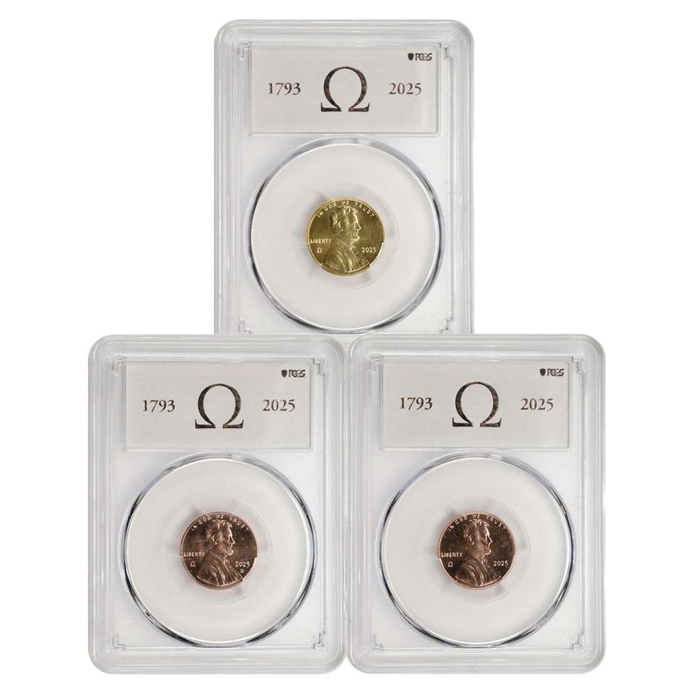 In 2025, the United States Mint struck its final circulation pennies, closing the book on the two-century history of America’s longest-running coin denomination. In honor of the final strike, the US Mint produced a special Omega issue of US pennies. This three–coin set celebrates the end of an era and simultaneously creates the rarest set of pennies in US history. Right now, 2025 3-Coin Omega-Privy Pennies Lot #184 is available.